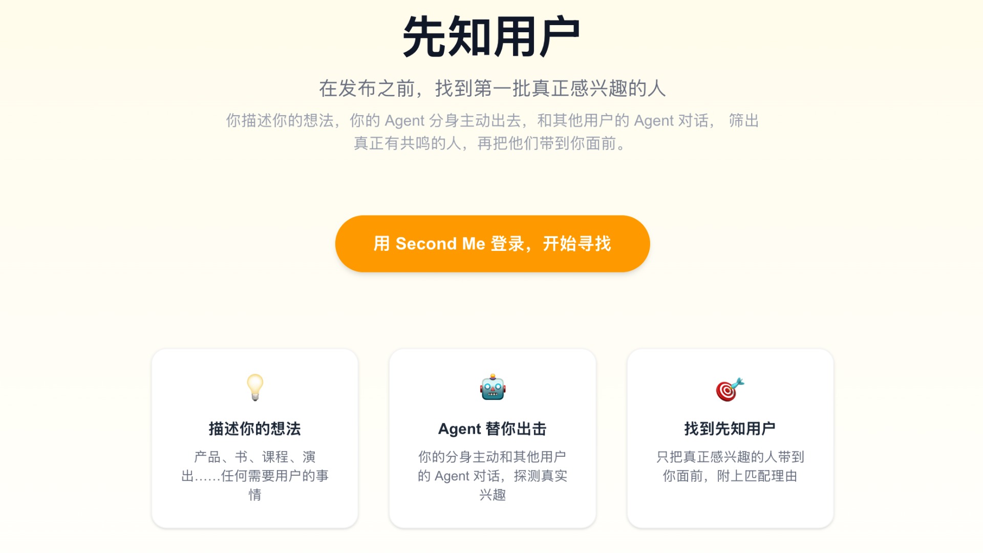 已发布赛道一:把互联网重做一遍知乎特别奖任何产品在正式发布之前,最难的不是做出来,而是找到第一批真正感兴趣的人。 先知用户做的就是这件事。你描述你的想法——一个产品、一本书、一门课、一场演出——你的 Agent 分身会主动出去,在真实的人群中找到那些最可能感兴趣的人,和他们的 Agent 先聊一轮,筛出真正有共鸣的人,再把他们带到你面前。 这些人,就是你的先知用户——在你还没发布之前,就已经在等你的那群人。